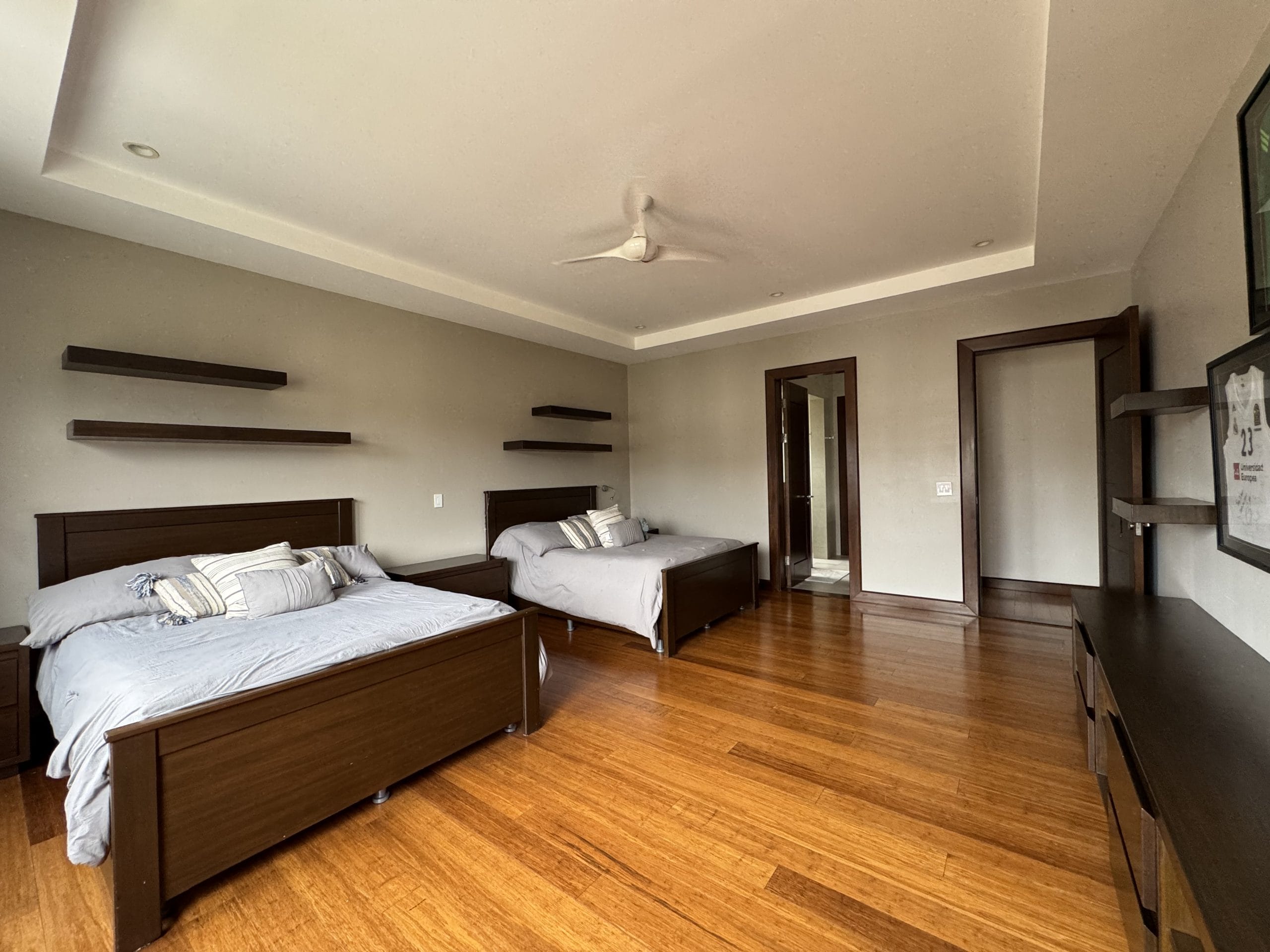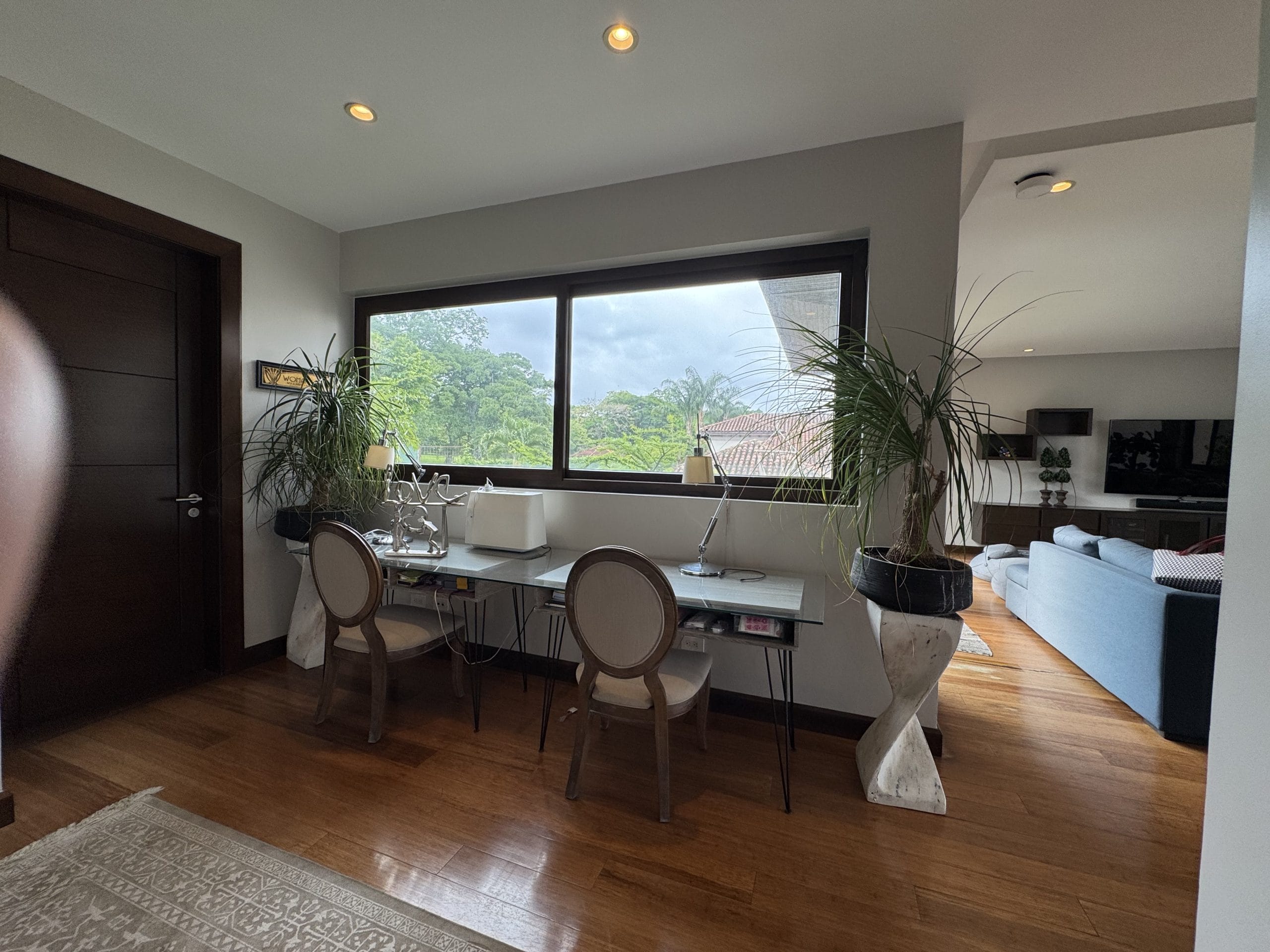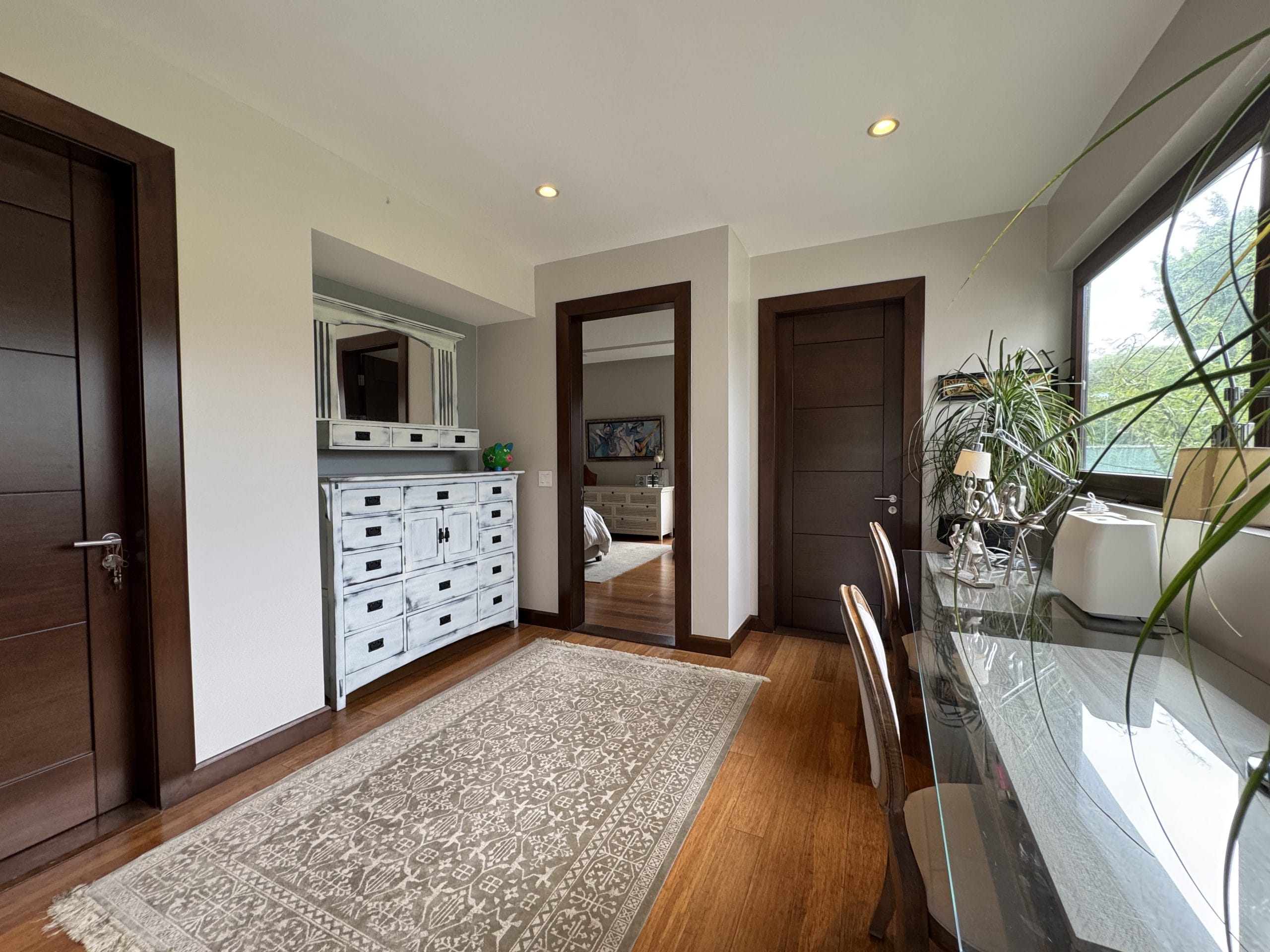It currently offers three en-suite bedrooms, each with its own private bathroom, plus a fully equipped additional bathroom, allowing for the easy creation of a fourth bedroom. The home also includes two TV lounges (one cozy space upstairs between the bedrooms, and a more intimate one near the breakfast nook), two separate home offices, and ample storage throughout with closets, a pantry, and utility rooms.