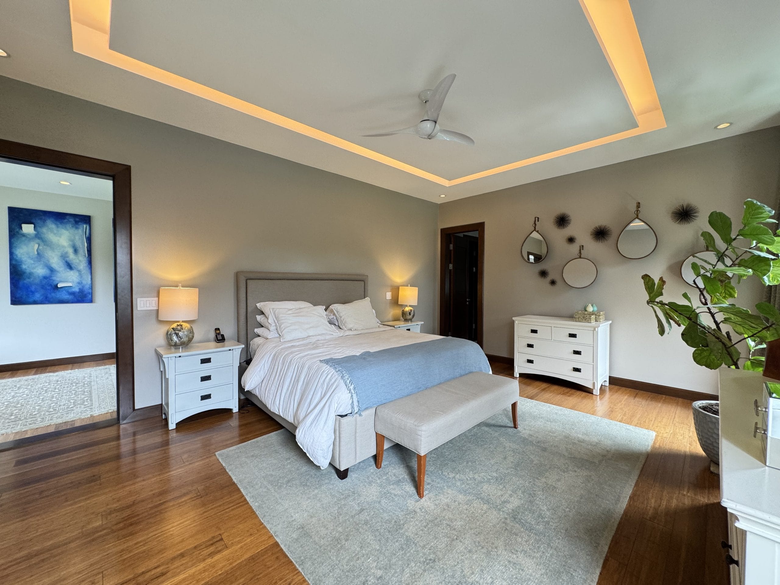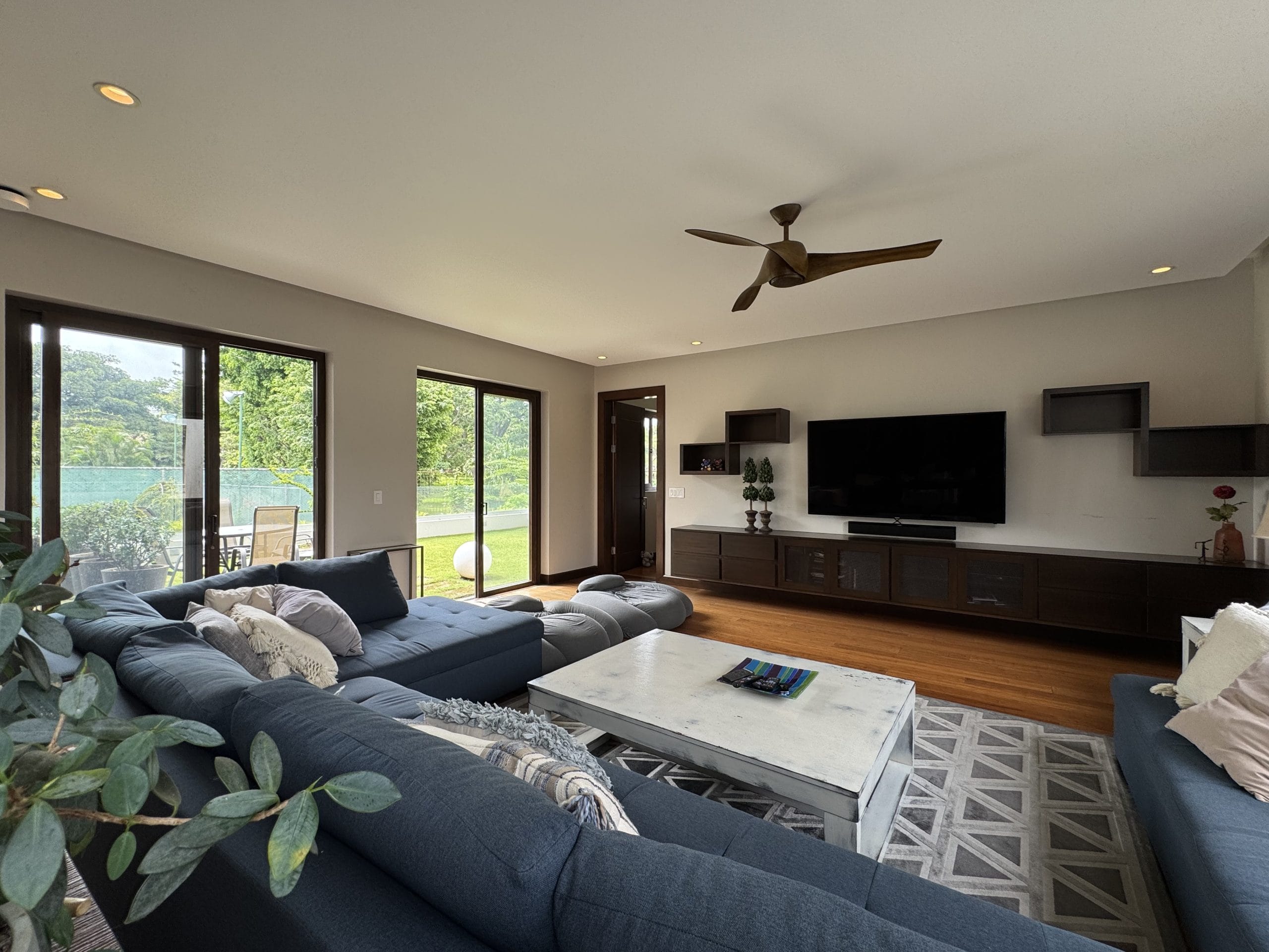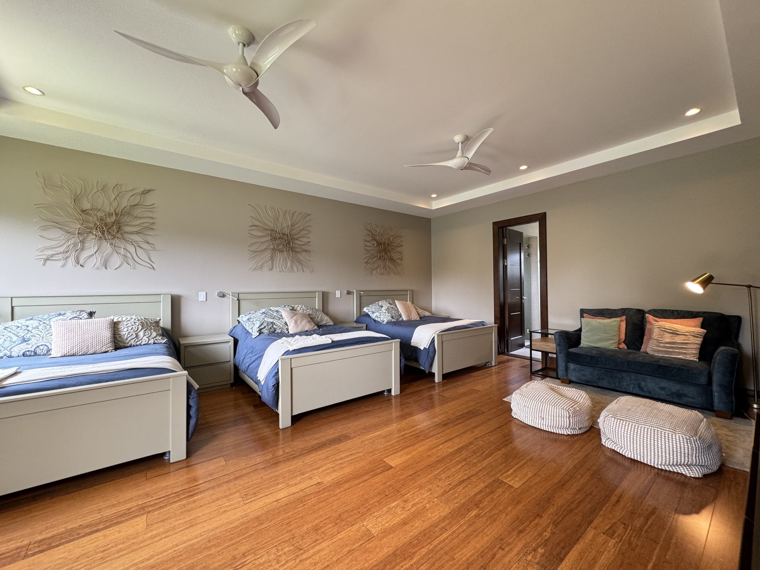 It currently offers three en-suite bedrooms, each with its own private bathroom, plus a fully equipped additional bathroom, allowing for the easy creation of a fourth bedroom. The home also includes two TV lounges (one cozy space upstairs between the bedrooms, and a more intimate one near the breakfast nook), two separate home offices, and ample storage throughout with closets, a pantry, and utility rooms.
